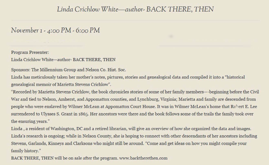 For more information, visit the Nelson County Historical Societysite where you will exact address, phone number and a map. Nelson County is about 2 1/2 hours south of DC. Come and spend a day or a weekend!